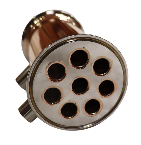 Boost the performance of your reflux column with a 3" copper dephlegmator. This Dephlegmator is the perfect upgrade for distillers who want tighter control, higher purity, and greater efficiency from their column. Crafted from high-quality copper, it rapidly knocks down vapor and delivers precise reflux management, allowing you to fine-tune flavor profiles or push for maximum proof with ease. The 3" footprint integrates seamlessly into small to medium setups, while the 1/2" coolant ports connect to a variety of plumbing fixtures and adapters. Durable, efficient, easy to integrate, and optimized for high performance, this 3" copper dephlegmator is the perfect upgrade for users seeking improved purity, stability, and reliability in their distillation setup.